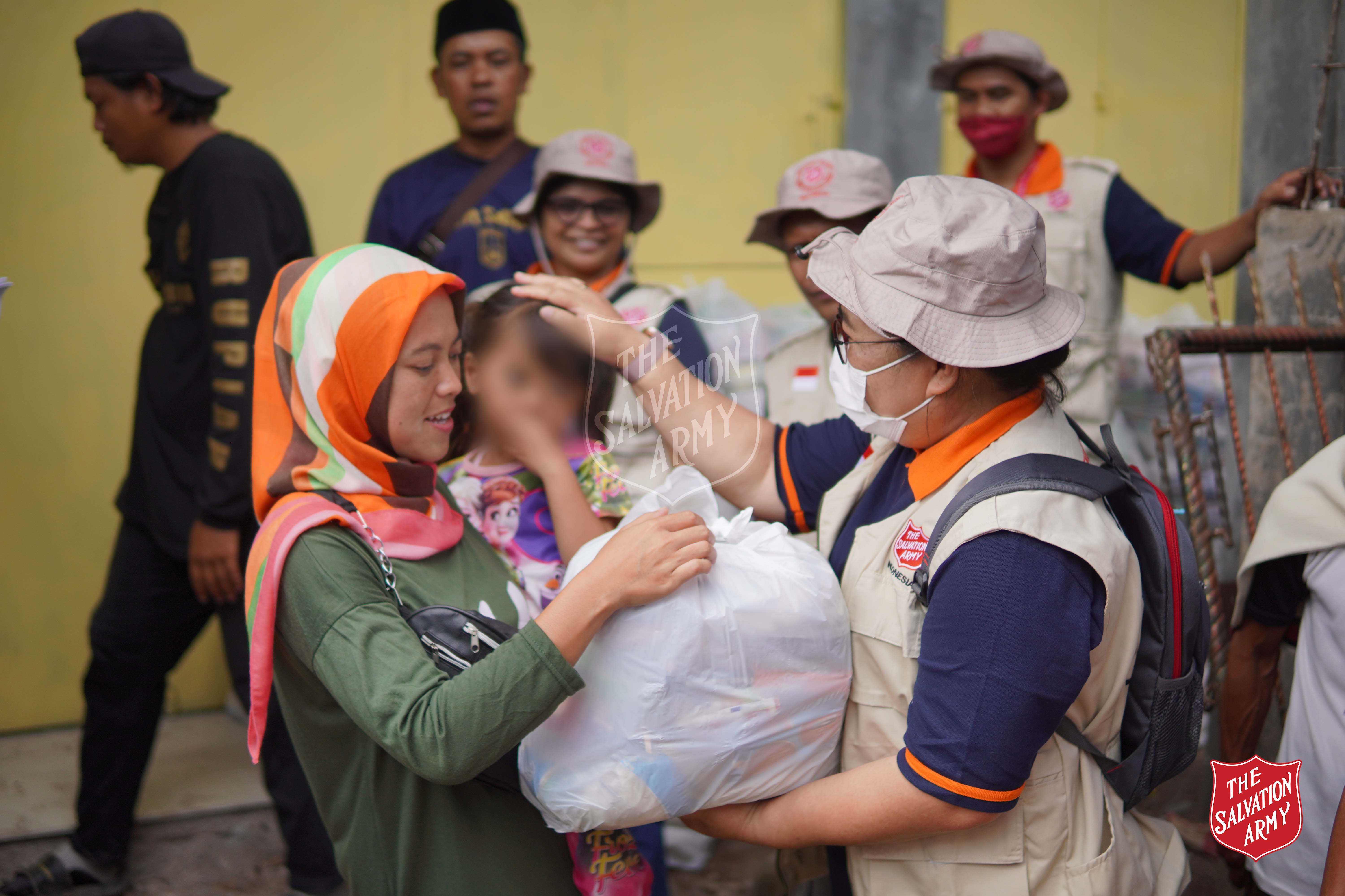 Kegiatan yang dilakukan oleh Tim Emergency Service Bala Keselamatan juga meliputi pembagian sembako. Seluruh paket sembako tersebut dibagikan secara merata kepada warga yang terdampak. Para warga sekitar yang umumnya masih belum berani kembali ke rumah mereka ini, sangat antusias serta bekerja sama dalam membagikan paket sembako yang berjumlah sebanyak 200 paket sembako.